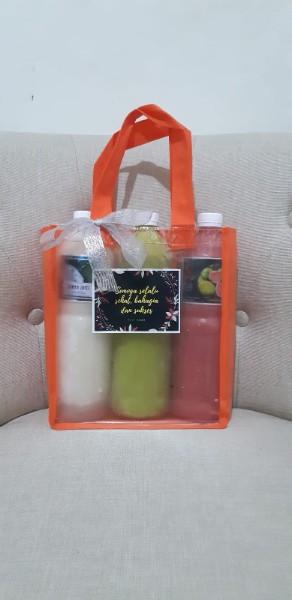 Terdiri dari tiga macam jus masing masing volume 1 liter, terbuat dari buah segar/fresh tanpa pengawet, tanpa essen dan tanpa bahan additive lainnya. Sehingga jus tergolong minuman sehat.