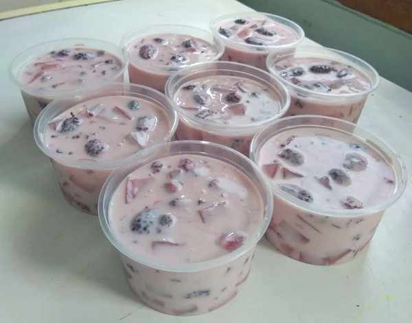 Salad Buah Mixberries Salad sehat tanpa pengawet dan bahan kimia tambahan. Terbuat dari campuran potongan buah berry pilihan berkualitas, yaitu blackberry dan strawberry yang dicampur dengan susu, yogurt dan natadecoco serta diolah sedemikian rupa dengan resep pilihan yang membuat rasanya lezat. Dijamin yang mencoba akan bisa merasakan kelezatan yang unik. Cocok juga untuk tambahan pilihan menu diet. Volume 300 ml Santap dalam kondisi dingin Penyimpanan dalam chiller samapoi 24 jam, selebihnya simpan dalam freezer.